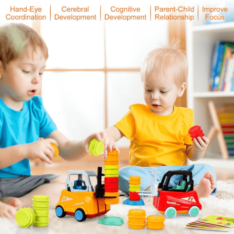 Setul conține două stivuitoare, galben și roșu, cu furci funcționale și roți care rulează ușor.