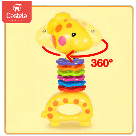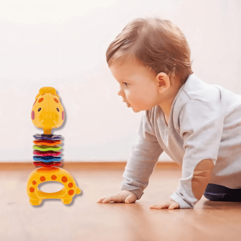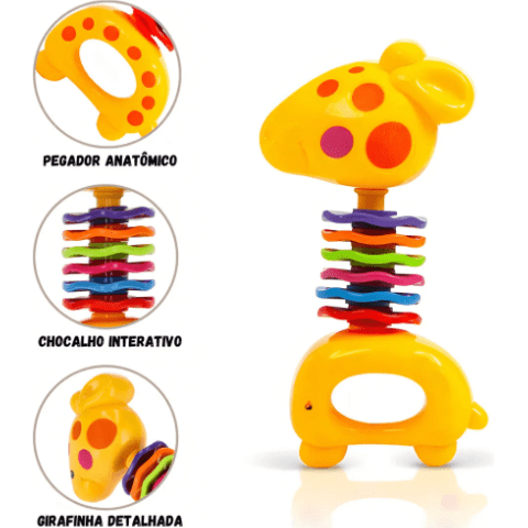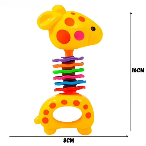 Zornăitoarea în formă de girafă are un design vesel, cu culori vii care atrag atenția bebelușului și stimulează recunoașterea vizuală.