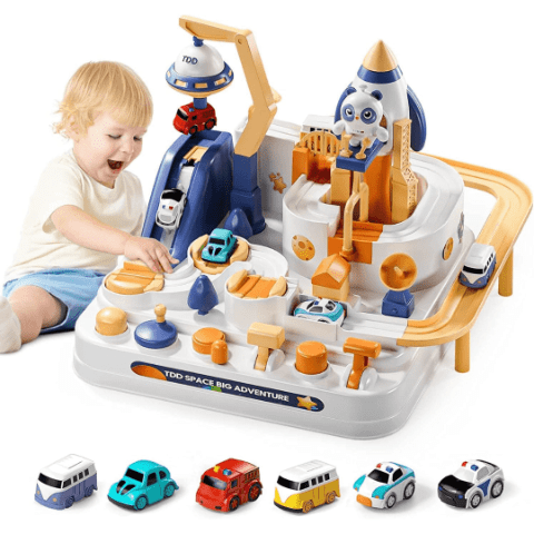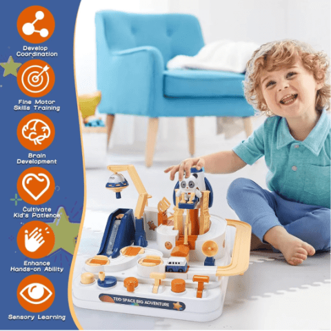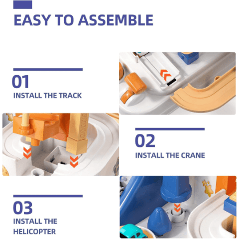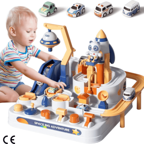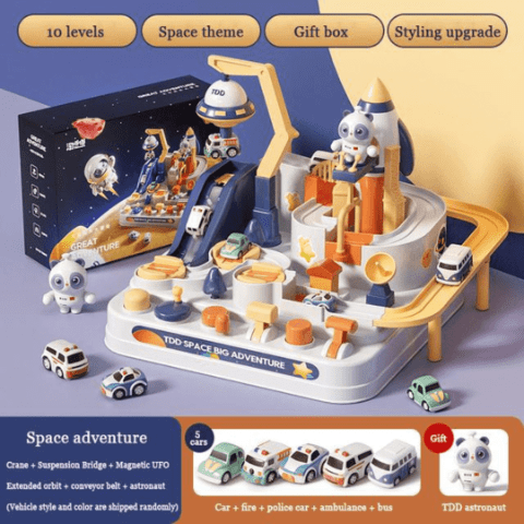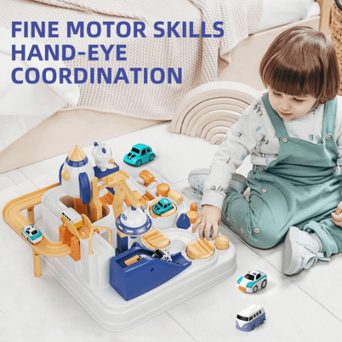 Setul include poduri, rampe și un sistem ingenios de lansare, care transformă joaca într-o adevărată aventură educativă.