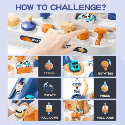 Fiecare mașinuță se deplasează pe trasee diferite, trecând prin provocări și obstacole ce stimulează logica și atenția.