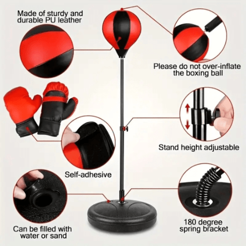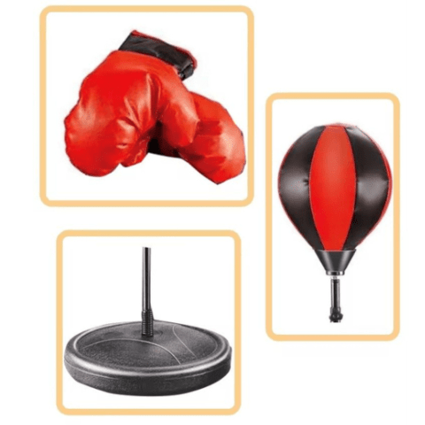 Setul de box pentru copii include o minge de antrenament pe stativ, perfectă pentru exerciții de coordonare și distracție.