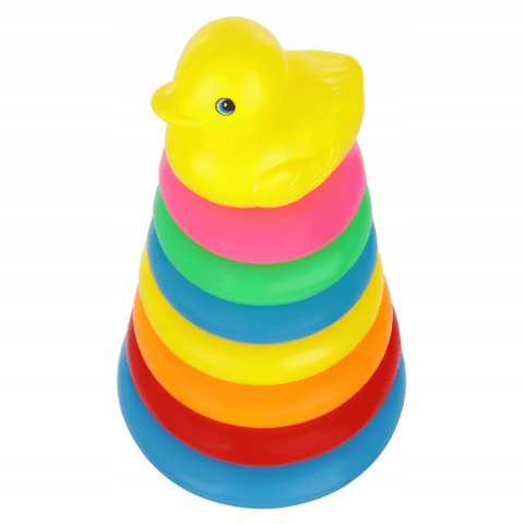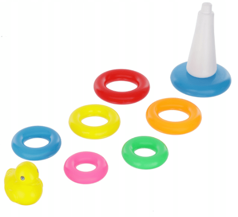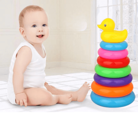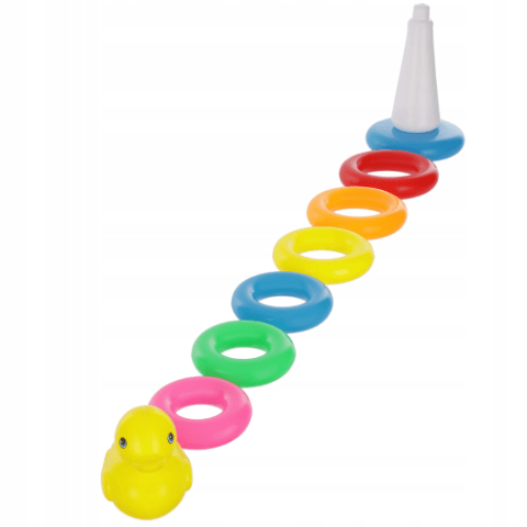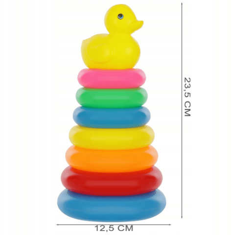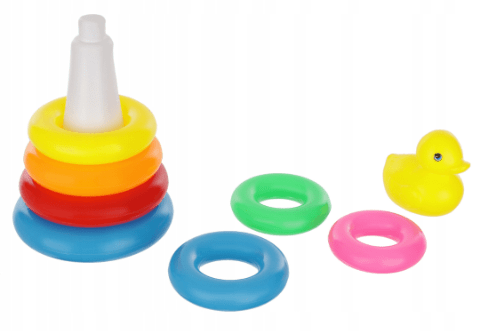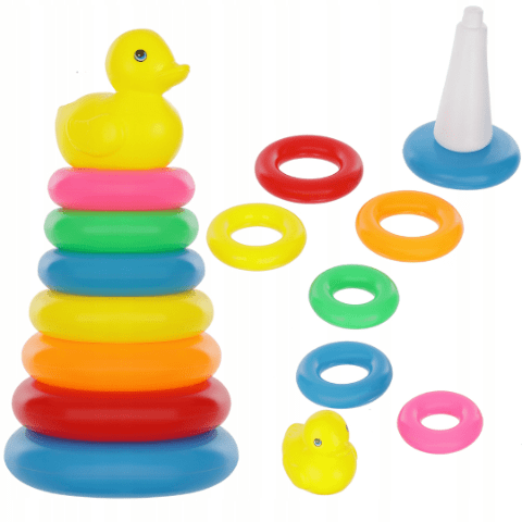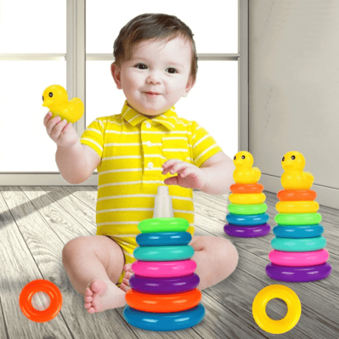Copilul se bucură să descopere culorile vii și să pună inelele unul peste altul, dezvoltând abilități motorii fine.
