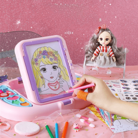 Trusa portabilă transformă desenul în joacă: copiii „machiază” personaje anime direct pe planșa din centru.