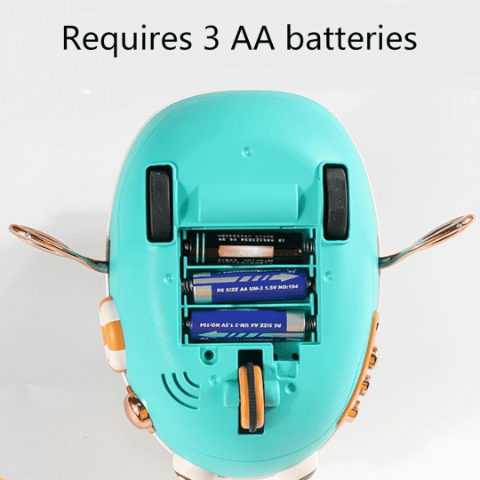 Jucăria funcționează cu 3 baterii AA, asigurând ore întregi de joacă plină de distracție și descoperire.
