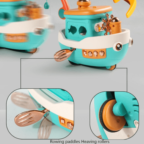 Barca interactivă are un design colorat și vesel, cu detalii realiste și veselie muzicală care atrage imediat atenția copiilor.