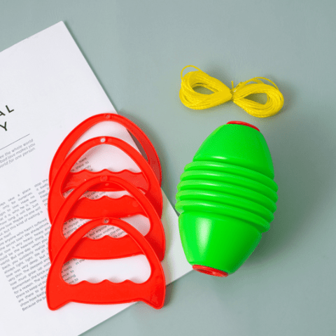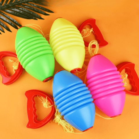 Jucăria colorată este realizată din plastic rezistent și vine echipată cu sfoară și mânere, oferind o experiență interactivă pentru copii.