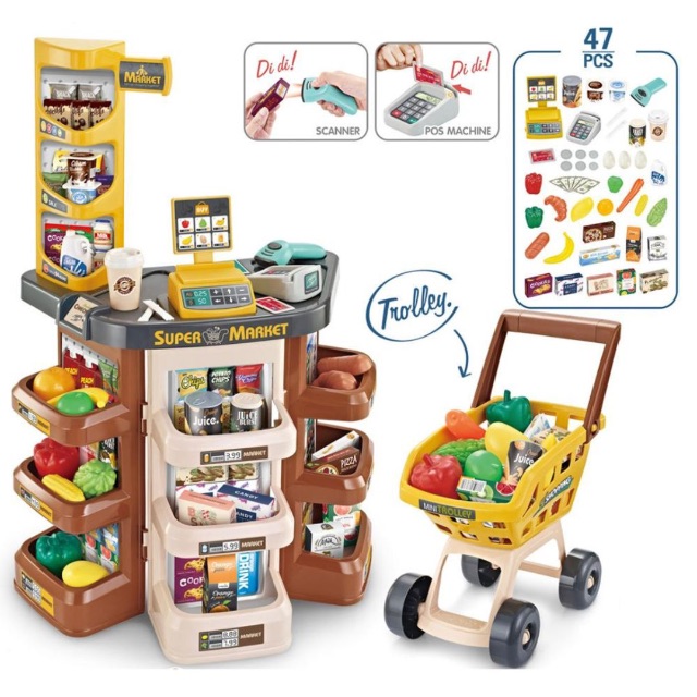 📦 Set mare cu 47 de piese – rafturi pline, produse alimentare, fructe și legume, bani, card, casă de marcat, scanner și cărucior pentru cumpărături, pentru joacă variată și fără plictiseală.