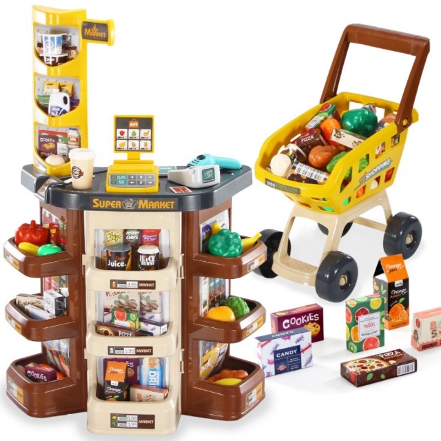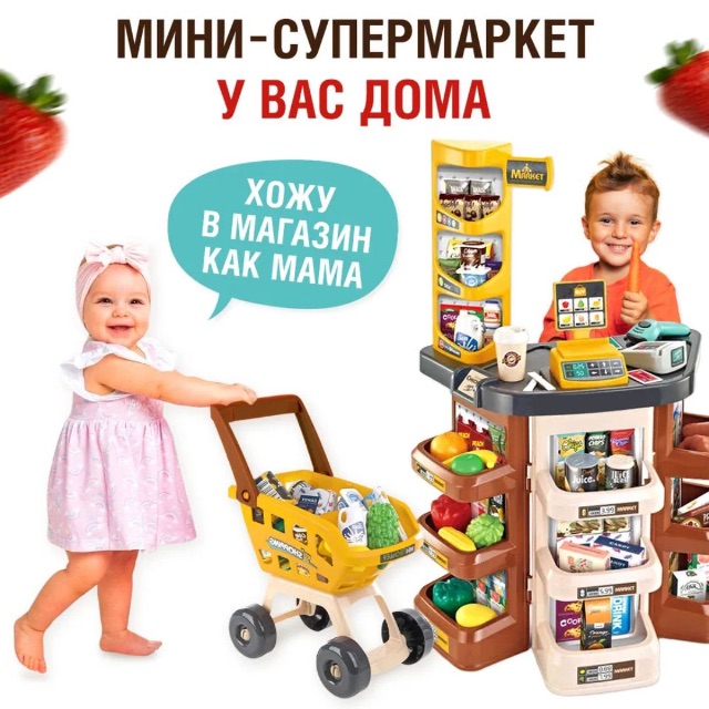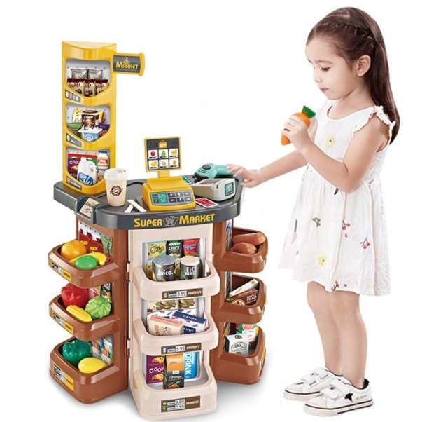🛒 Cărucior de cumpărături inclus – copilul își umple coșul, îl împinge și își organizează „cumpărăturile”, dezvoltând coordonarea și motricitatea grosieră.