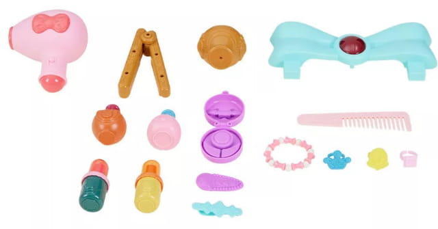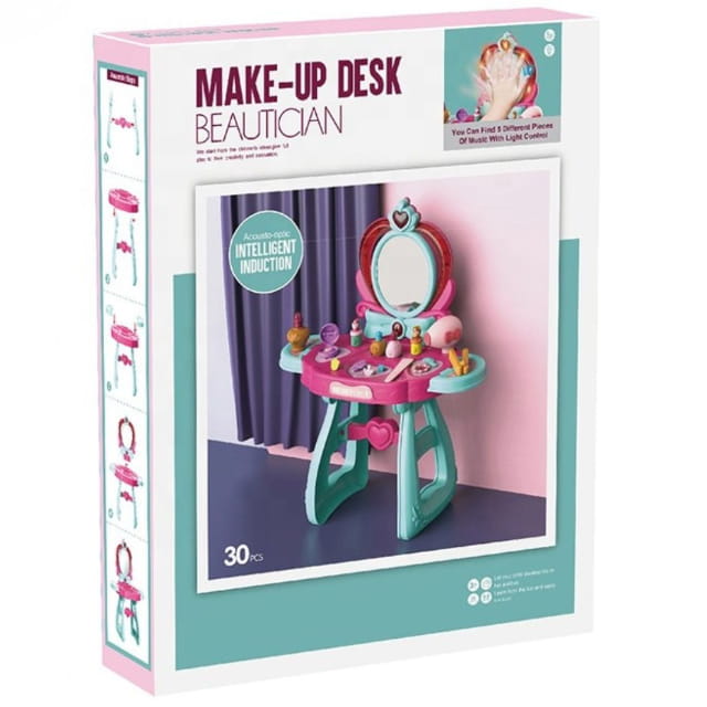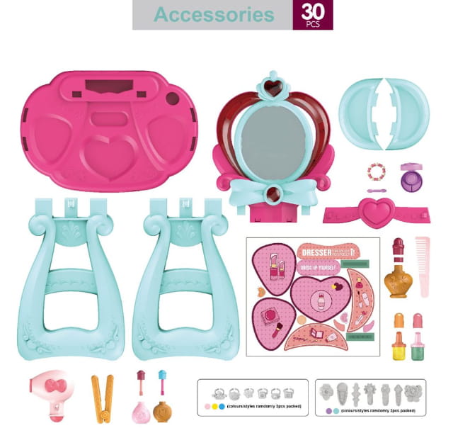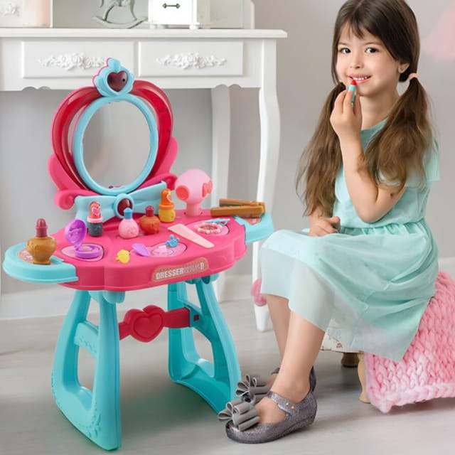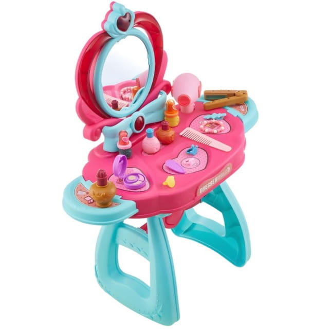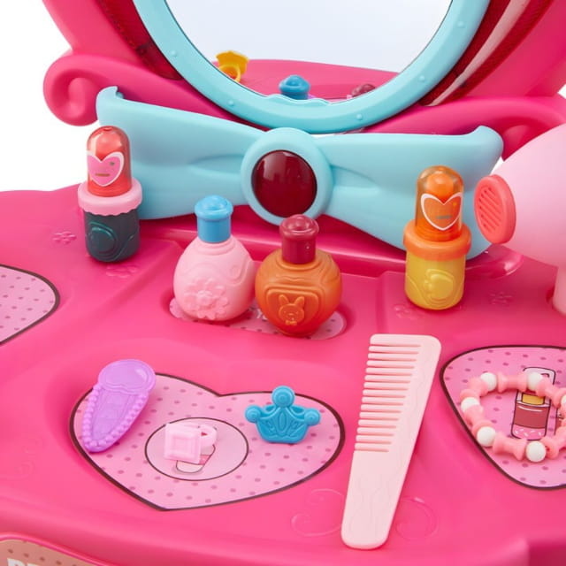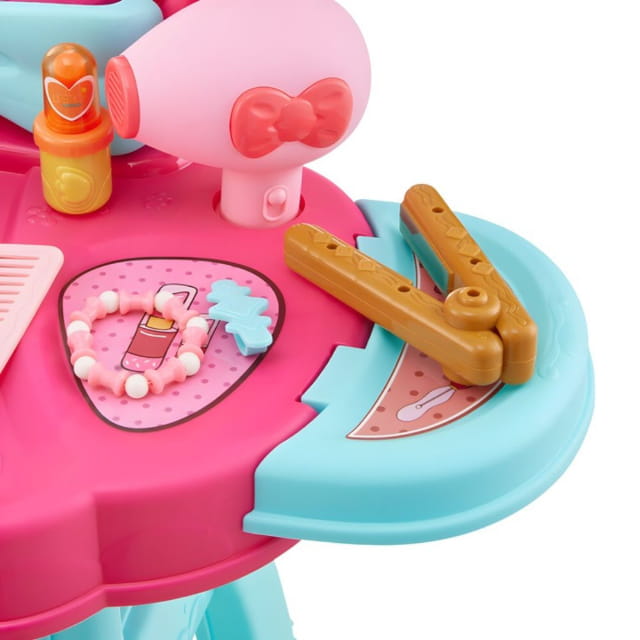 🪞 Masă de toaletă completă, cu multe accesorii – oglindă, uscător de păr de jucărie, pieptene, clești, bijuterii și elemente decorative pentru joacă variată.
