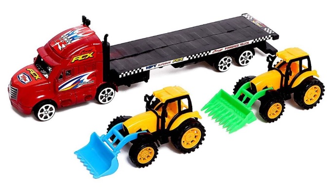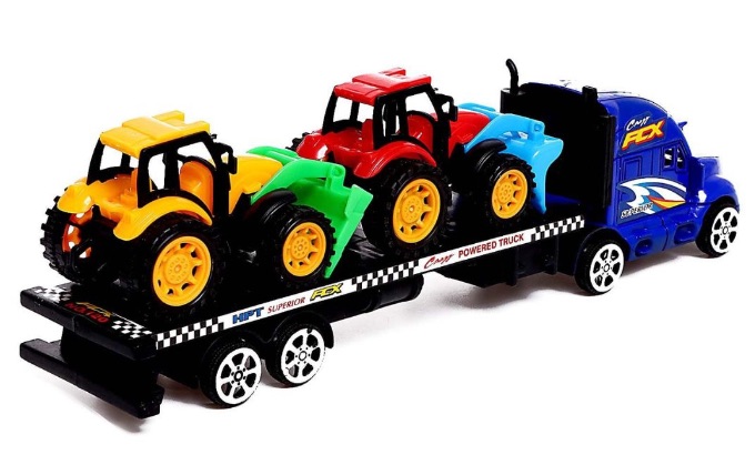 Camionul transportor cu platformă și 2 tractoare utilaje transformă joaca într-o misiune realistă de transport pentru micii pasionați de mașini mari.