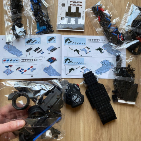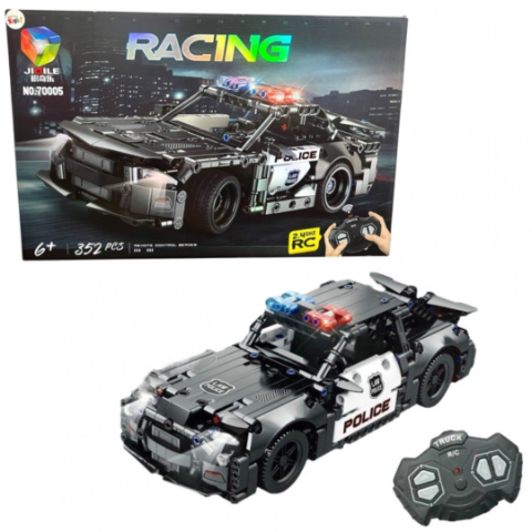 Setul conține 352 de piese tehnice care se îmbină pentru a construi o mașină detaliată, echipată cu lumini LED albastre și roșii ca o adevărată mașină de patrulare.