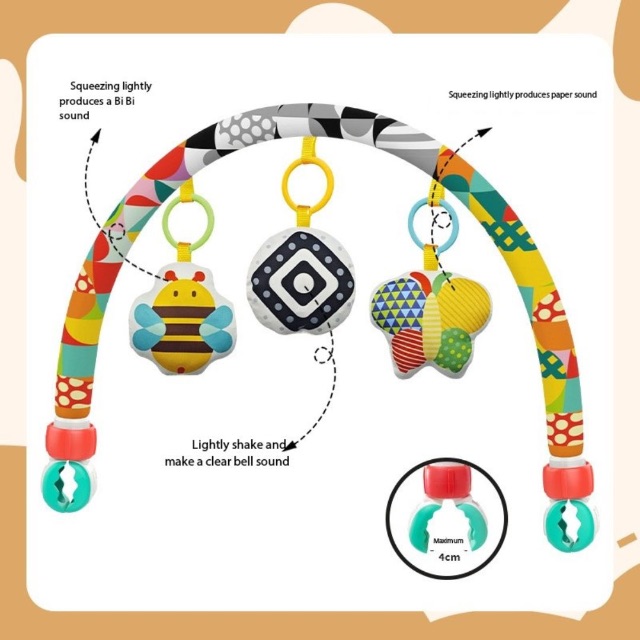Stimulează dezvoltarea timpurie a bebelușului cu această arcadă senzorială reglabilă, concepută pentru pătuț, cărucior, scoică auto sau balansoar.