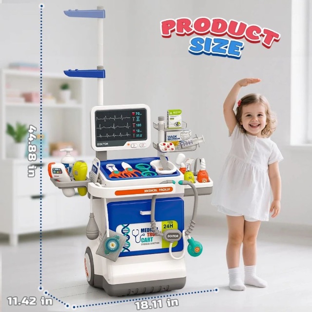 Transformă camera copilului într-un adevărat cabinet medical cu acest cărucior doctor interactiv de 32 piese, echipat cu monitor, stetoscop și accesorii realiste.