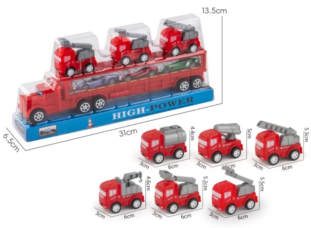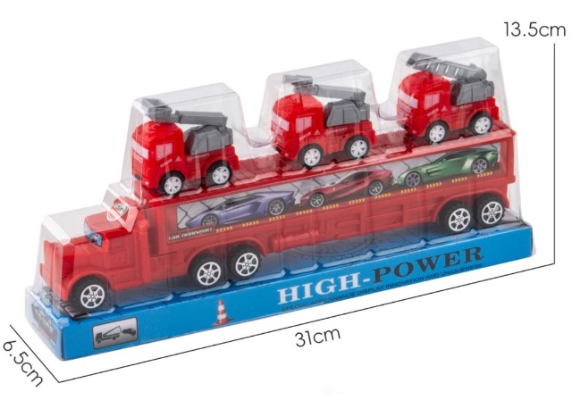 🚒 Camion transport de 31 cm care include 3 autospeciale de pompieri, pregătite pentru misiuni de salvare și intervenție.