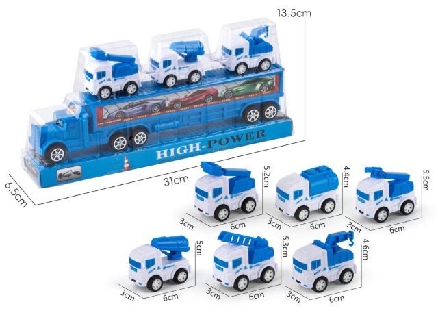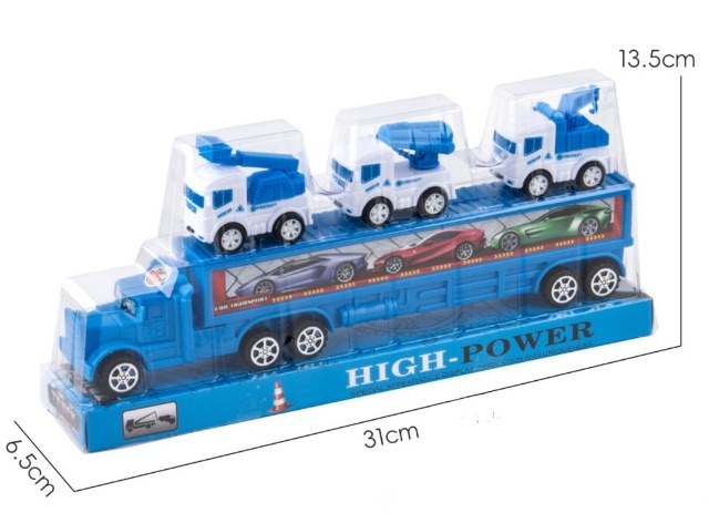 🚛 Camion transport de 31 cm care include 3 mașini utilitare de intervenție, oferind un set complet pentru jocuri pline de acțiune.